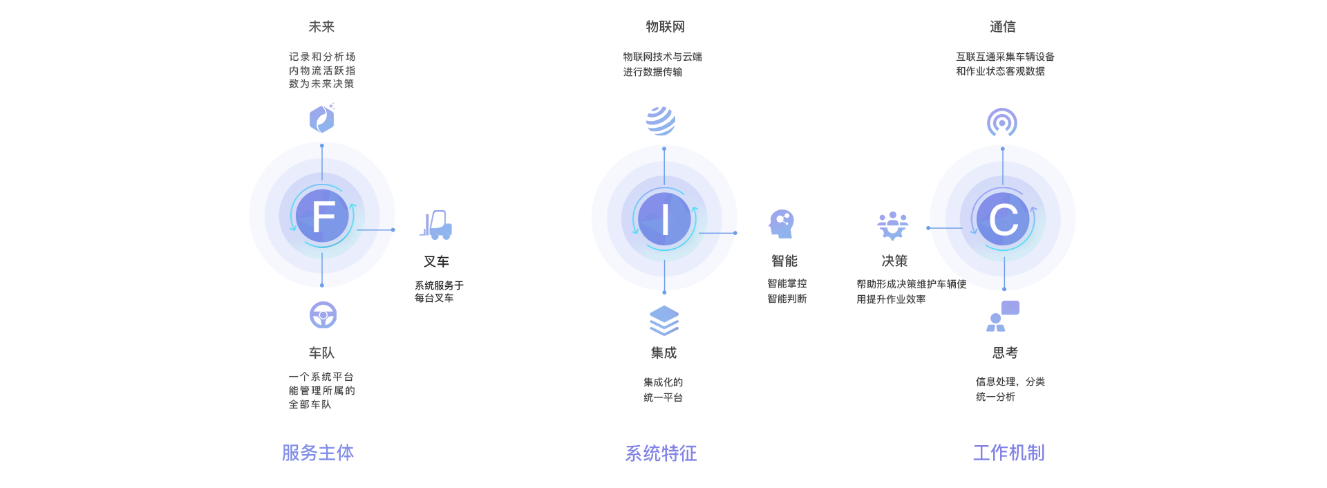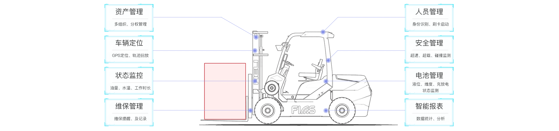 通过传感器获知叉车状态和人员作业情况并接入互联网、驾驶员、维修工、管理员等即可通过电脑、手机、车载设备终端了解车辆设备状态、使用状态、因此能随时随地掌控情况、实现高效的车队管理。